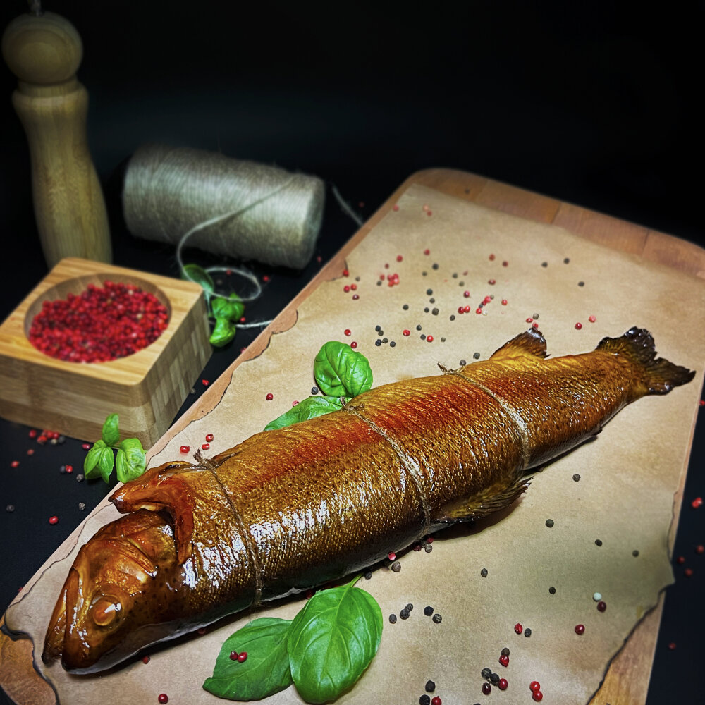 Свежевыловленная форель горячего копчения в фирменных специях. Цена указана за готовый вес.
