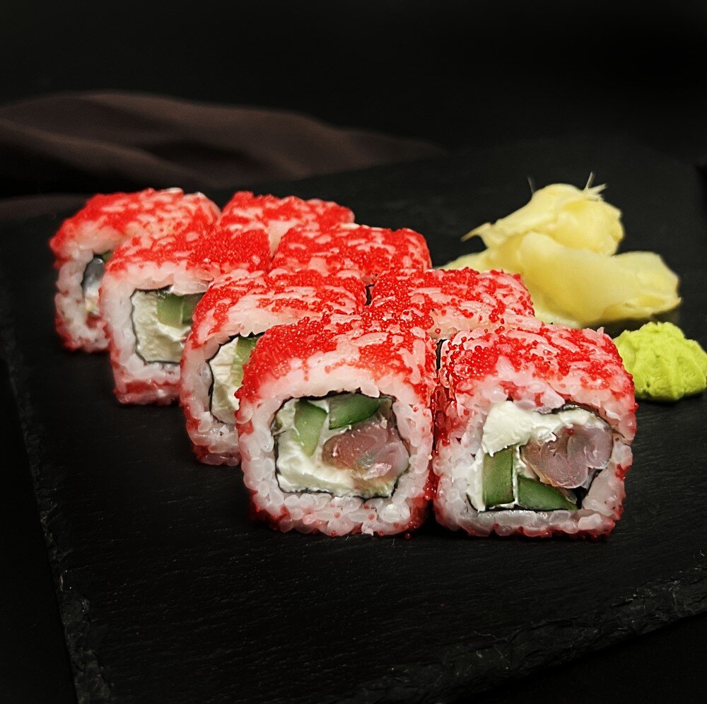 Рис, нори, сливочный сыр, огурец, тигровая креветка, икра Масаго