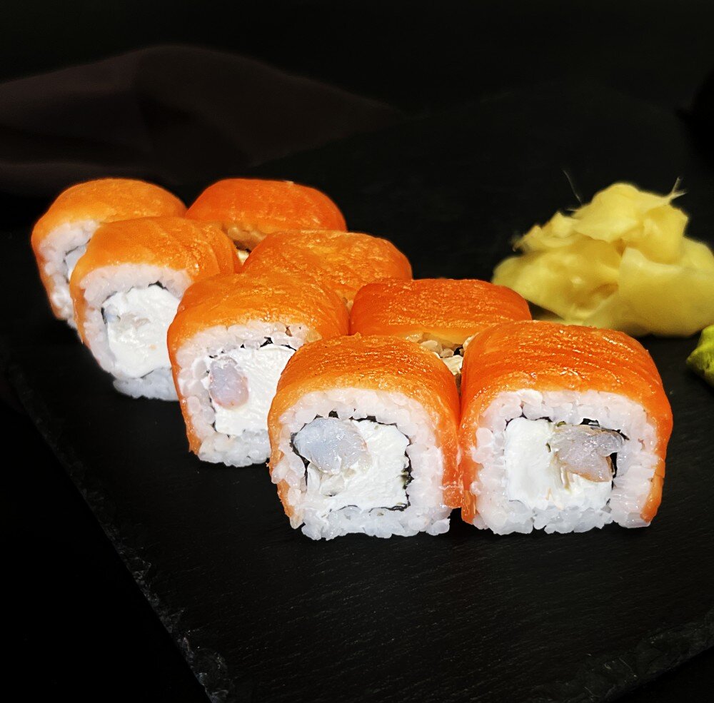 Рис, нори, сливочный сыр, лосось, тигровая креветка.