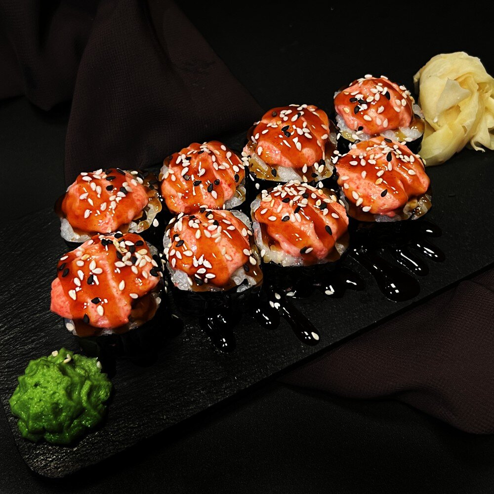 Рис, нори, омлет, соус Яки, соус Унаги, кунжут